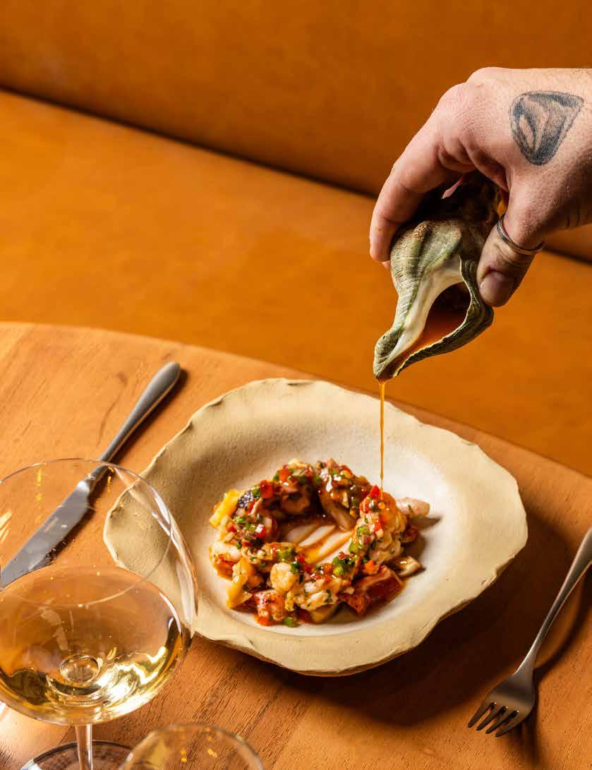 Casa Juani is the debut restaurant concept from chefs (and married couple) Eduardo Valle Lobo and Kelly Jeun, Frasca Food & Wine alums who also helmed kitchens in New York restaurants Eleven Madison Park and Del Posto. Serving inventive yet familiar Spanish fare with a focus on fresh seafood, Casa Juani is a love letter to Valle Lobo’s 98-yearold mother, Juanita, who raised him and his three siblings in Madrid. “I get emotional talking about it,” Valle Lobo says. “She stayed home, taking care of the family, cooking seven days a week with super delicious ingredients. She sacrificed a lot for us. It’s what she’s always done.”