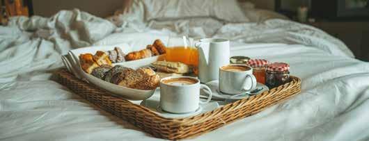 Mix up mimosas or serve coffee with flavored syrups and whipped cream for a café vibe. Then, snuggle up in bed and watch a favorite movie or TV series.