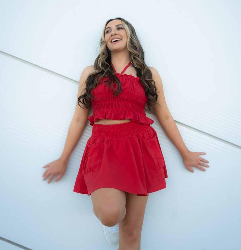 Clare sports a Modern Moves redcropped halter top ($42) and Modern Moves pocket detail skirt ($52).