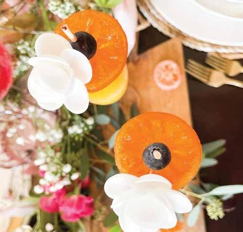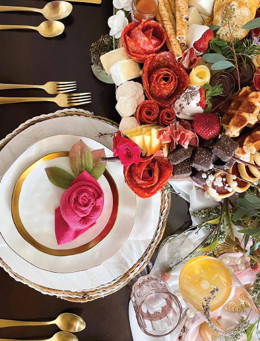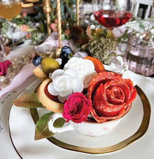 At the heart of this spectacular spread, a bouquet of floral offerings takes center stage featuring assorted chocolate florets, delicate white rose wafers, and salami and cheese blossoms. Perfectly crafted and delicious, they establish the visual and gastronomic theme for the entire display. Accompanying the spread are glasses adorned with edible floral rims, beckoning you to sip and savor the essence of spring; dried lavender, marigold, rose, lemon peel and lily garnishes provide vibrancy and are entirely edible. Elevate the visual appeal with rosefolded napkins and a sprinkle of seasonal flowers atop layers of fresh greenery.