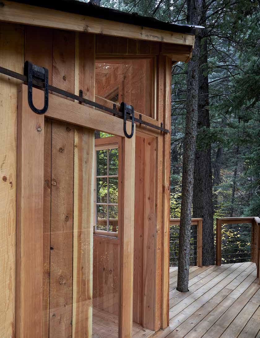 The sleek black dog leads us up the spiral log staircase to the deck surrounding the tree house, which is 20 feet high in places and tucked near some native boulders with the creek surrounding it on three sides. Turning slightly, I am ushered through an old barn door and into the tree house–one room with a wood burning stove in one corner and an L-shaped couch on the adjacent walls. We set our warm beverages on the coffee table bench and take a breath as the dog settles in.