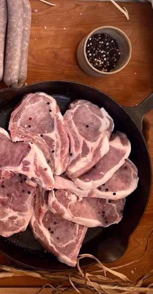 That care shows up on the plate. Pasture raised pigs grow at a slower pace, developing richer flavor, deeper color, and beautiful marbling. “Our pork is not the other white meat, it is deeper in color with gorgeous marbling.” The pork is noticeably different from conventional options, with a darker pink hue and a taste that surprises first time customers.