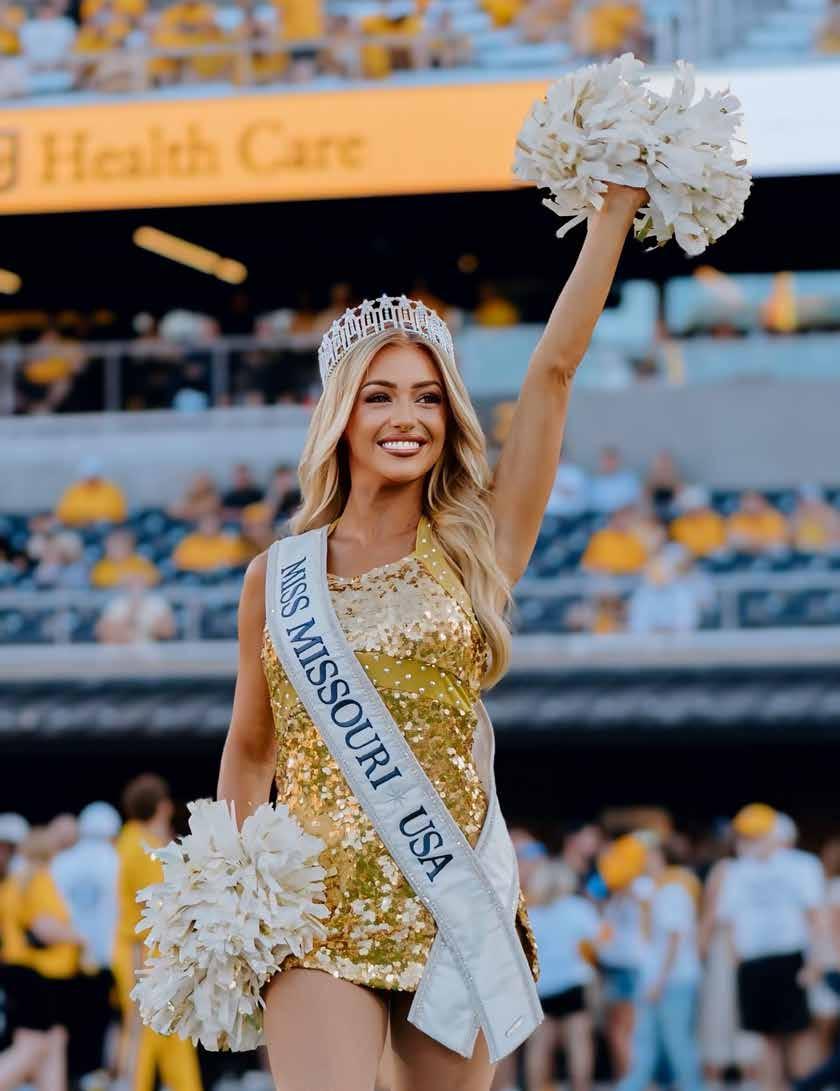 Long before the pageant stage, Shae’s foundation was built on Faurot Field. As a member of the Mizzou Golden Girls, she learned what it meant to represent something bigger than herself.