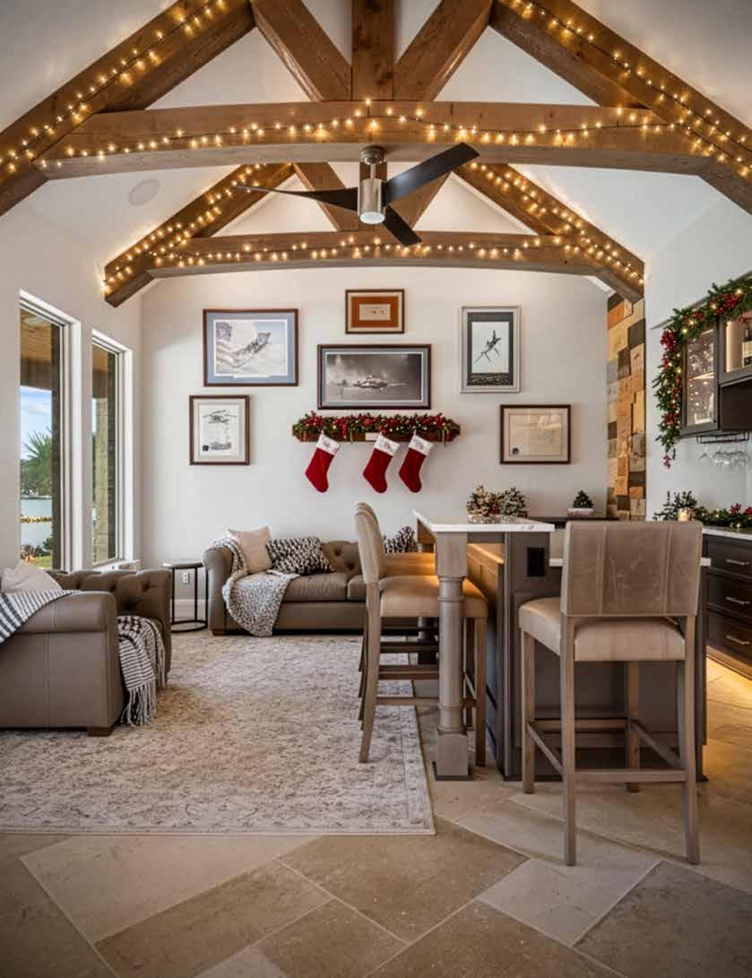“Our favorite seasonal touches are often the simplest,” Chastity says. “Custom fireplaces that become the heart of the home, warm wood tones that soften winter light, and vaulted ceilings that make gatherings feel intimate and bright.”