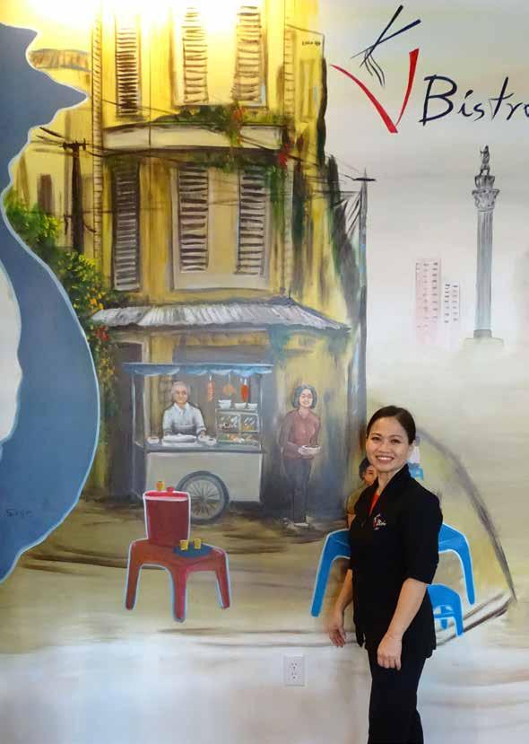 It's readily apparent that family, honor, and hard work are paramount to Julie. “We are very proud of our accomplishments,” she said. “My sisters and I, we’re proud of our heritage, and we’re proud of our parents for giving us the skill and the passion to succeed in the restaurant business. They removed our fear, and now here we are.” As she spoke, over her shoulder was a hand-painted mural that depicts V Bistro’s humble origin story: her parents serving people from a food cart in Vietnam. The mural is not only a talking point