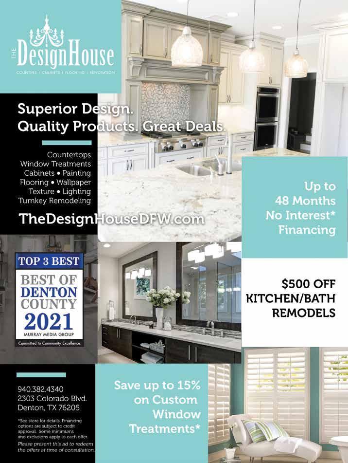 Dr. Kimberly Gronberg, D.D.S., M.S. • Dr. Charlene Sugay, D.D.S., M.S. 3000 Village Parkway, Suite 430, Highland Village, TX 75077 972.966.2326 | GronbergOrthodontics.com Thanks for Voting us Best of Denton County for 13 years We are here to serve you safely and professionally. FREE CONSULTATION FOR NEW PATIENTS Call today for an appointment or free consultation for new patients. EQUIPMENT REPAIRS • LIGHTING • REMODELS & UPGRADES • WEEKLY SERVICE Honest | Dependable | Highly Reputable | Locally Owned and Operated 469-599-0805 | flowermoundpoolservice.com 35 | CITYLIFESTYLE.COM/CROSSTIMBERS MAY 2023