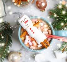 1. Thread three large marshmallows onto a skewer, straw, or toothpick to create the snowman’s body.