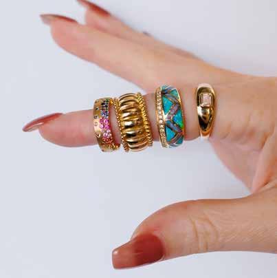 A variety of Beasely’s pieces also fit today’s trend of gold statement pieces. Many of their top-selling rings feature bold gold settings, turquoise inlay, confetti rainbow sapphire accents, and swirling, sculptural details.