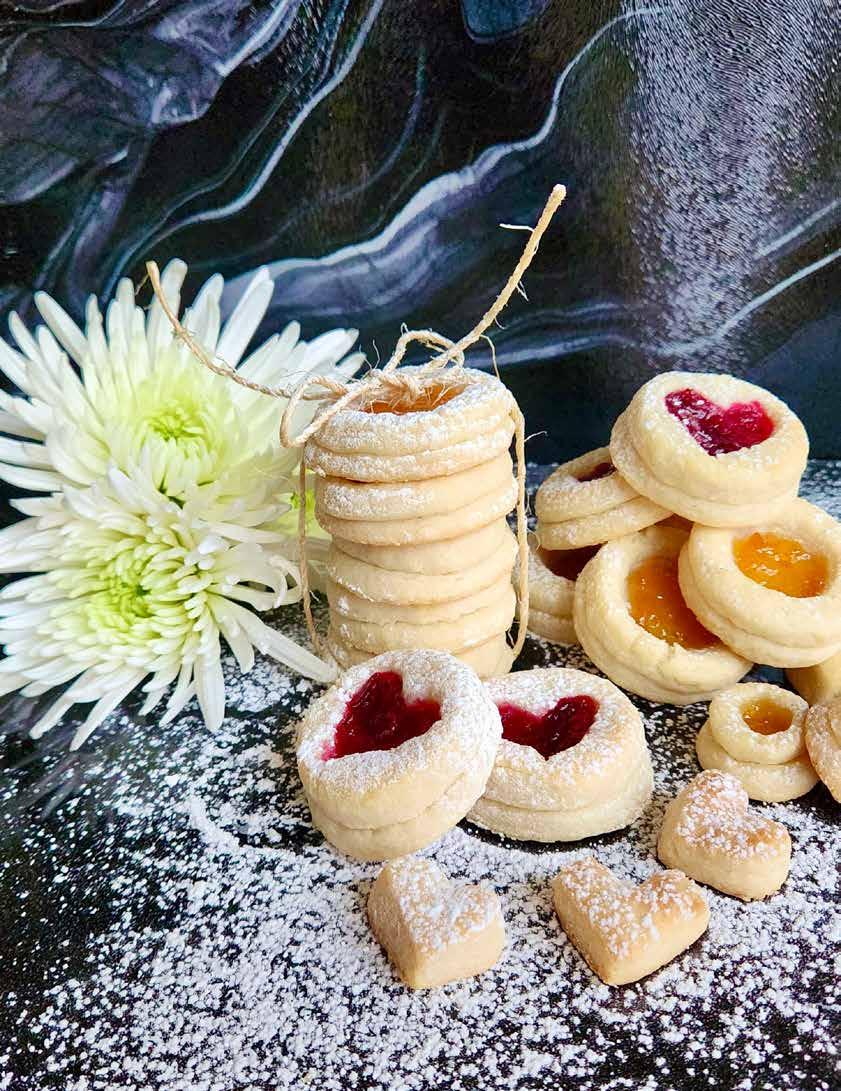 Sabina, from this month’s article on ski jumping, takes baking to new heights. Growing up, her favorite part of this irresistible cookie was always the preserves. She always felt the ratio of cookie to preserves was off. Once she started baking, she decided to balance the ratio to her liking, and created a show-stopping masterpiece. Blending silky cream cheese with quality butter offers this light and flaky cookie a subtle sweetness, making the addition of sugar to the dough unnecessary. It feels unusual to omit sugar from a cookie. Honestly, after months of sweets, it’s a welcome departure. Sabina’s unique shape creates a perfect vessel, and once the generous dollop of a favorite preserve melts into the airy nest, the omission of sugar becomes clear. Watching this cookie evolve from start to finish is a fun and mindful baking experience you can share with a kiddo or loved one. With versatility in shapes and preserve preferences, there’s opportunity for everyone to personalize their little cookie to be exactly how they want it to be.