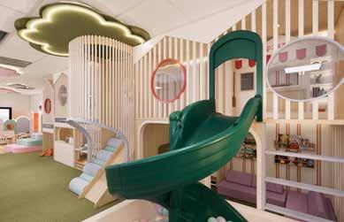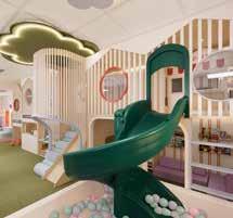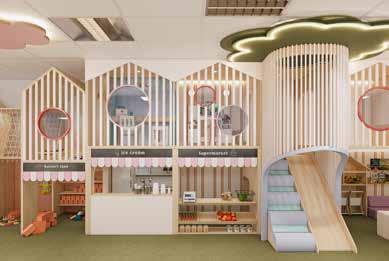 “The idea is that moms and kids both want to come here equally. The cafe seating is small and quaint enough that from any point in the space, the parent can see the child in the little play area,” says Kelly. “The play area includes a lot of imaginative play, such as a little grocery store, a nursery area, and a hair salon. There is also a curved slide and climbing structure just the right height for younger kids.”
