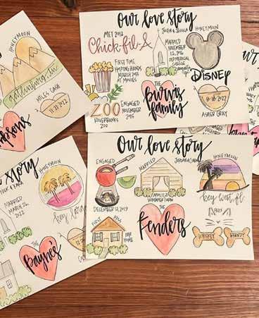 It’s a personalized watercolor maplike painting of a couple’s love story. It starts with where you met then continues to your first date, when you got engaged, your wedding, your honeymoon, and your children. A Love Story Board is one of my favorite things to do. It’s so special to people because it tells their love story and, really, their life story. It’s something that they likely have displayed in their home and it’s so personal.