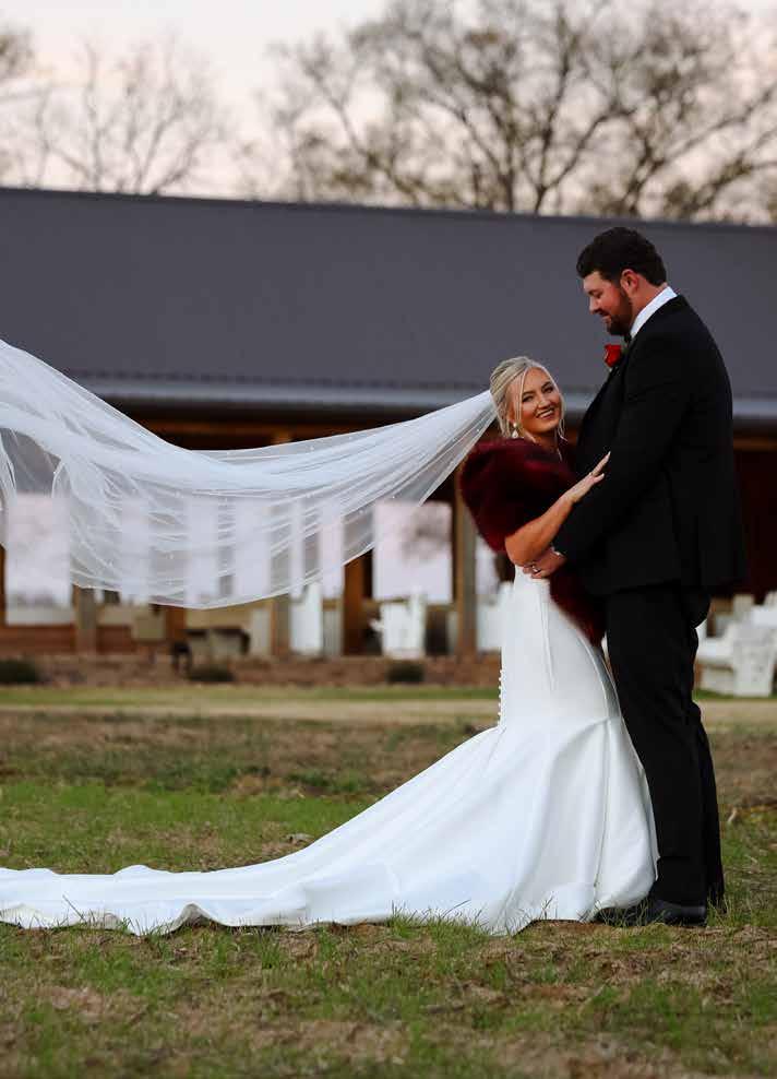 Clay proposed on December 24, 2024, setting the tone for a celebration rooted in the magic of the season. Nearly a year later, on December 13, 2025, the couple exchanged vows at The Barns at Gunn-Stewart Farm beneath clear skies and perfect winter weather. With red, green, and black woven throughout the décor, the day reflected a Christmas-inspired palette that felt elegant, cozy, and timeless.