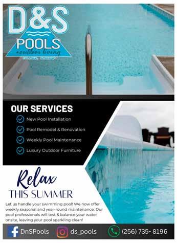 Splash into summer with D&S Pools + Outdoor Living. D&S offers new swimming pool installation, renovation, remodeling, servicing and luxury outdoor furniture. D&S Pools + Outdoor Living is your state-licensed and insured pool contractor, with 30-plus years of experience. It brings the industry's highest quality materials and latest technology to the job. Relax with the new maintenance program, and seasonal and year-round pool service. Call 256-735-8196 or visit www.facebook.com/DnSPools