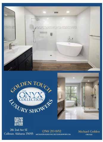 Golden Touch Luxury Showers brings high-end bathroom design and remodeling to Cullman with stunning luxury showers and tailored installations. Located at 216 Second Ave. SE, Golden Touch specializes in creating beautiful, functional spaces that elevate everyday living. Whether you’re upgrading or remodeling, their expert team delivers quality craftsmanship and personalized service. Visit goldentouchluxuryshowers.com to explore products, services and schedule consultations.