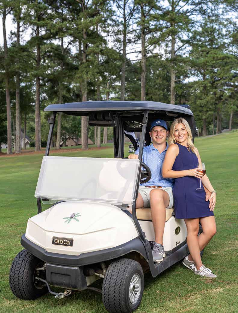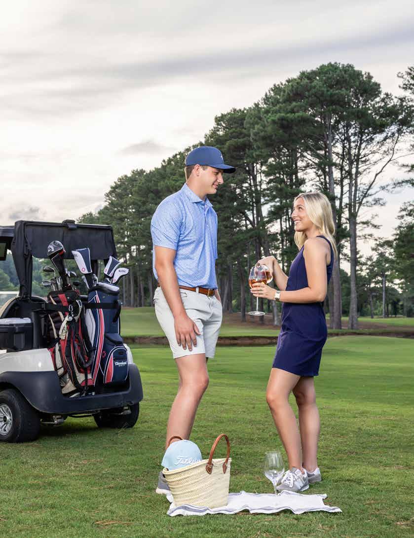 Our golfing couple - Tucker Hughes and Abby Gurley - look very stylish on the green. Hughes visited the Pro Shop at Terri Pines and found the perfect attire for the perfect round of golf. Gurley visited Three Pears Boutique. Her Spanx dress is sporty and stylish, ideal for a round of golf, pickleball or lunch with friends! A picnic basket, with glasses and Sancerre Rosé procured from Gervais & Lulu Vins and Champagnes, rounded out their beautiful day on the course.