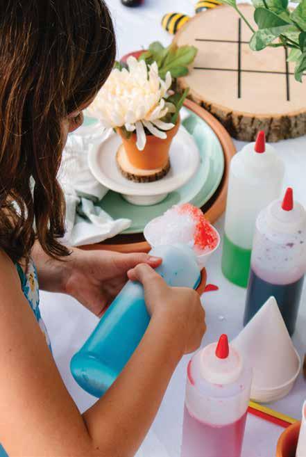 Use a snow cone machine to shave ice into snow cone cups. Top with your favorite flavor—either store bought snow cone syrups, homemade syrups, or our favorite—fruit concentrates. Stay cool and celebrate the last days of summer heat!
