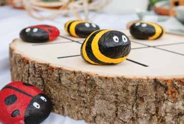 1. Game Pieces: Paint your rocks with acrylic paint. For Tic-Tac-Toe you’ll need a total of 8 rocks, 4 of each type (here I’ve painted 4 lady bugs and 4 bumble bees). For Checkers you’ll need a total of 24 rocks, 12 of each color (here I’ve used black stones, painting half of them red).