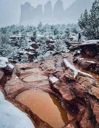 A hiker photographed near the Seven Sacred Pools during snowfall in Sedona, Arizona