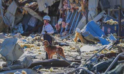 Texas A&M Task Force 1 K9 specialist Denise Corliss and her K9 Partner, Rennes, search for victims at a Houston explosion site on January 24, 2020