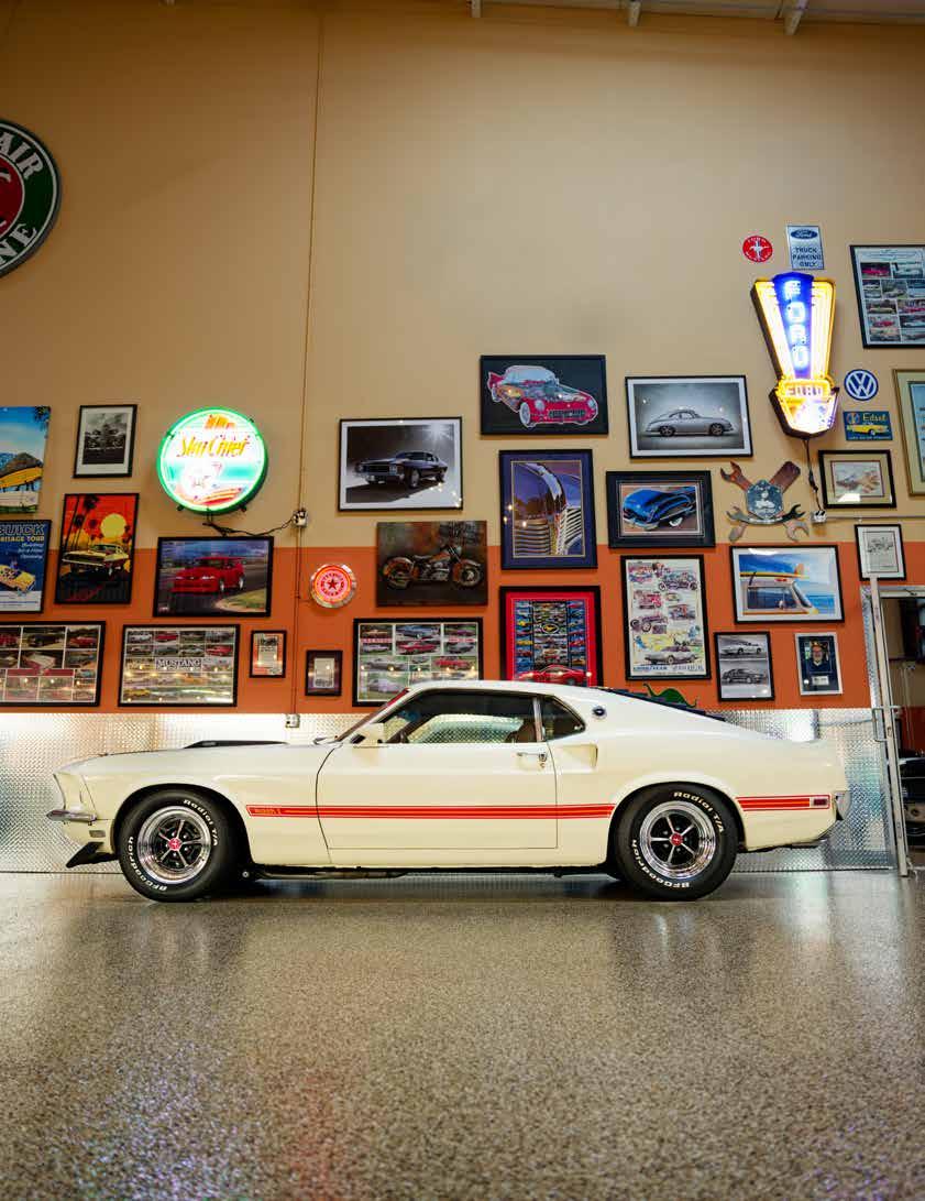 automobiles gleam under soft light, each one immaculate. Some are valued in the hundreds of thousands, yet others hold their worth in sentiment alone. The 1969 Ford Mustang Mach 1 428 Cobra Jet Engine is one of Lydecker’s favorites. “It’s a fast car and it’s a driver.”