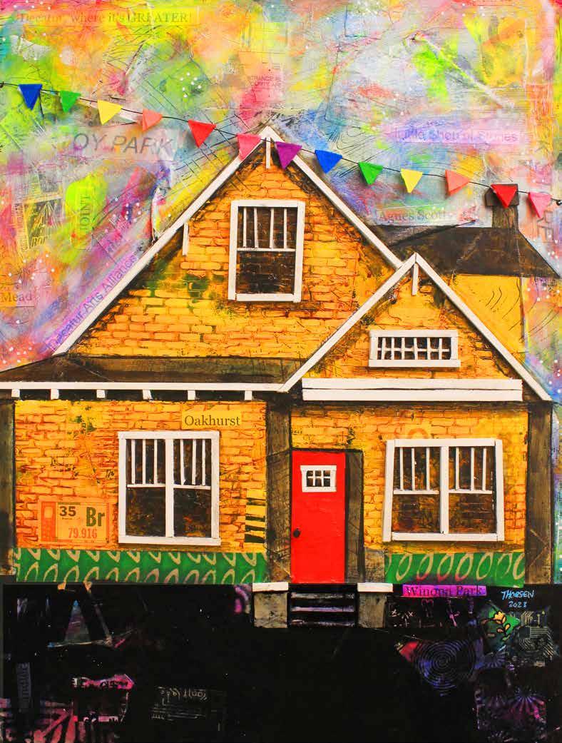 Thorsen's mixed media artwork "123 Hill Street" draws creative inspiration from the traditional craftsman bungalows that line the streets of Atlanta's historic Oakhurst neighborhood. The collage incorporates names of landmarks around the city, like well-known shops and restaurants, along with other touches paying homage to Decatur's treasures. See more of Thorsen's work at https://thorsenart.com/