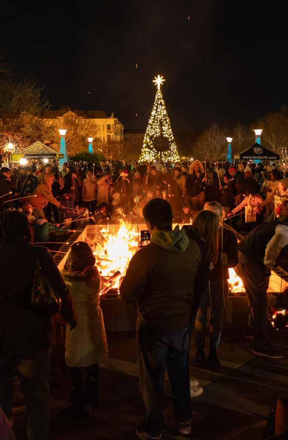There’s an ancient serenity that comes from gathering around a fire with your community. It feels life-giving amidst the cold air, and everything sparkles with beauty in the glow of firelight. Decatur’s annual Bonfire is viewed by many as the pinnacle of the holiday experience schedule. Coordinated between all City of Decatur departments, especially fire, police, and public works, it’s a collaborative creation that alights our town with holiday cheer. The Talley Elementary choir sings, and thousands of sticks with marshmallows are handed out for roasting. Last year, they gave out over 2,500! Many neighbors bring their own sticks or save theirs from previous years, which is much appreciated.