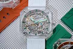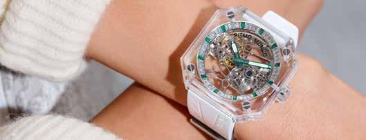 The 44mm cushion-shaped glass case offers a 360° panoramic view of its skeletonized mechanical watch movement and dial designs – offered in a range of hues and dial variations including brushed dial rings and crystal accents.