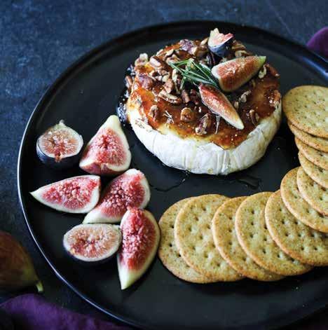 directions: Place brie in a baking dish. Spread the fig spread on top of brie and sprinkle with chopped pecans. Drizzle with honey. Add fresh herbs, and bake at 350 degrees for 20 minutes. Serve with pita chips or crackers.