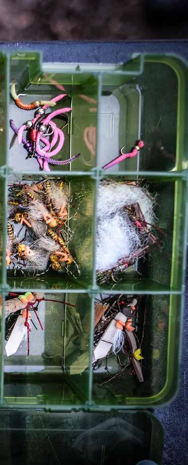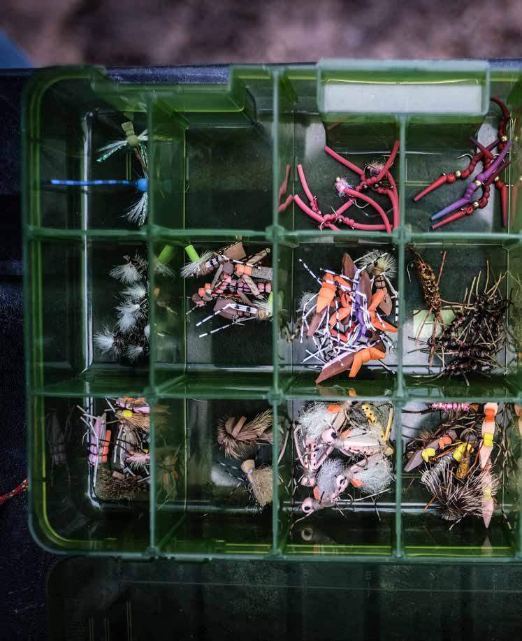 McKinley discovered fly fishing at age 11 when a dazzling fly-tying demonstration caught his fancy. The men deftly spiraled colorful craft supplies around tiny hooks. Threads, fine wires, chenille yarn, marabou feathers, tiny crystalline beads—these items, when twisted, imitate the food that fish like to nosh. Wooly Buggers. Lucky-B’s. Jigged Mini Leeches. Rat-Faced McDougals. Whatever the nickname, dry flies are most commonly designed to mimic caddis flies, stone flies, and mayflies. Wet flies will resemble the nymph or underwater adolescent insect. Streamers are flies that imitate smaller fish such as minnows.