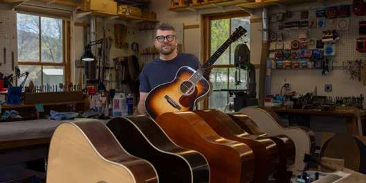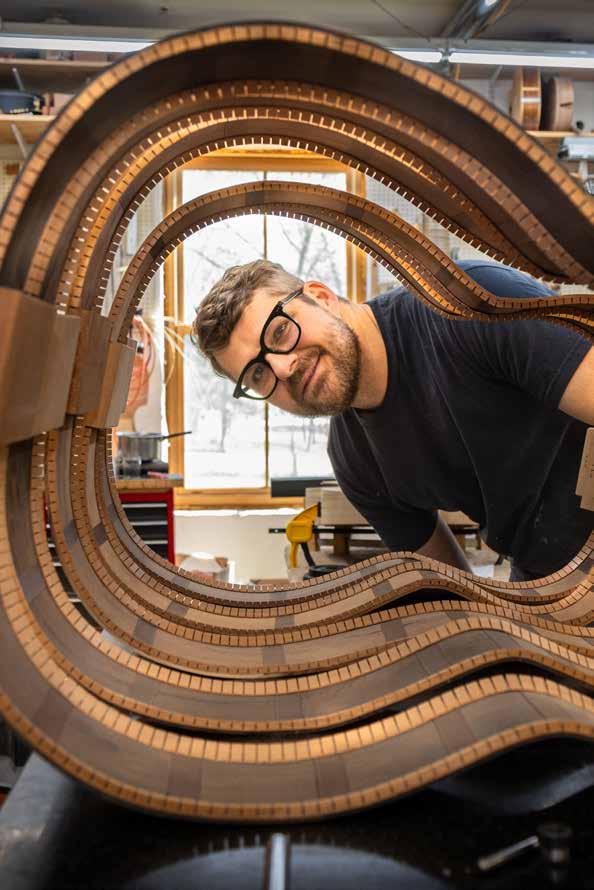 Twenty years later, Baxendale boasts a two-year waitlist on custom orders—these in addition to guitars brought to the shop for repairs. The work is meticulous and painstaking. Baxendale explains, “Nothing on a guitar is flat. The top is domed, and the back is domed even more. There are angles to everything. If you have [the back and top] perfectly parallel, the sound will bounce back and forth and not travel. You kind of want it more erratic so it’s going out of the hole as fast as it can.”