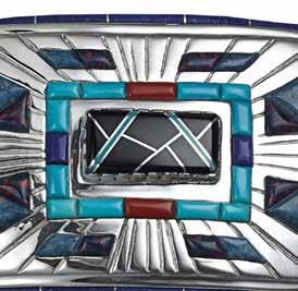 Ben Nighthorse Campbell’s jewelry is not merely pretty—it’s hypnotic. It doesn’t just gleam; it radiates life. Rather than a composition of metals, the medium of his craft seems composed of actual starlight, tapped directly from the source. Inlaid into this silvery syrup are not just gemstones, shells, or crystals, but supernovas and comet streaks, tweezed directly from the cosmos. Ben painstakingly smelts and hammers these elements into cuff bracelets, earrings, pendants, buckles, and more.