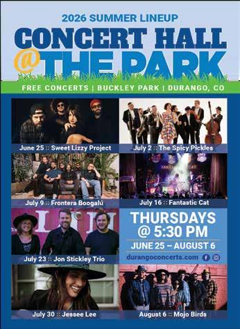 All aboard the Durango Bluegrass Train, May 28–30, 2026, for a one-ofa-kind musical journey through the San Juan Mountains. Enjoy live bluegrass performances in every railcar as you ride the historic train, moving between coaches, dancing, and taking in breathtaking scenery along the way. DurangoBluegrasstrain.com