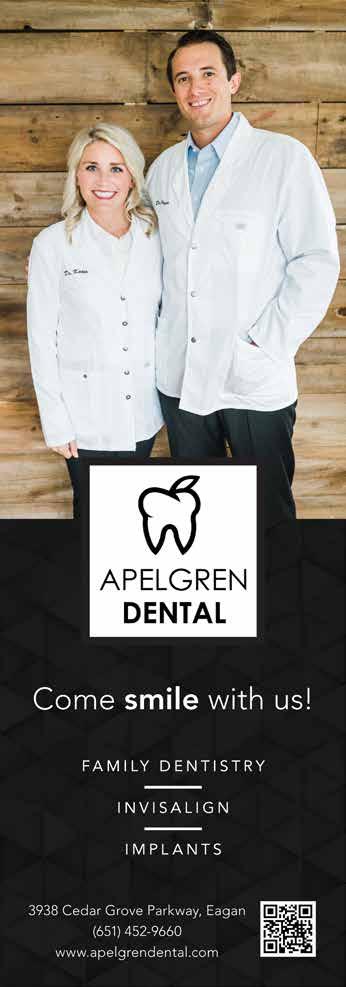 Healthy Breakfast & Lunch Shakes • Energy Teas • Iced Coffee Nutrition Education SCAN ME stepupnutrition25@gmail.com @stepupnutritioneagan @stepupeagan Practitioner Owned Complimentary Initial Consultations Board Certified Orthodontic Specialists www.smileshaping.com | 651-405-1055 2130 Cliff Road Suite 220 Eagan, MN 55122 DOCTORS Aamodt | Erickson | Brown SERVING THE SOUTH METRO SINCE 1989 SHAPING GREAT SMILES FOR ALL AGES ERICKSON/AAMODT ORTHODONTICS Squeaky Clean ServiCeS iSn’t juSt a Cleaning Company WE’RE YOUR ONE-STOP SHOP FOR KEEPING YOUR PROPERTY LOOKING ITS BEST! RESIDENTIAL AND COMMERCIAL CLEANING | CARPET CLEANING | WINDOW WASHING FLOOR STRIPPING & WAXING | PAINTING | POWER WASHING Ready to get your space squeaky clean? 612.501.8436 | www.squeakyservices.com 37 | CITYLIFESTYLE.COM/EAGAN JULY 2023