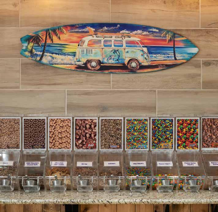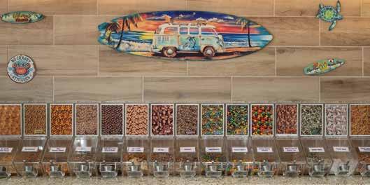 Walk into the store, and one detail immediately steals the show: a huge palm tree in the center of the room. Other Yogurt Beach locations often use preserved palm plants inside, but that isn’t exactly a safe bet during a Minnesota winter. So when Doreen’s space came with a support post near the center of the shop, the family decided to have fun with it.
