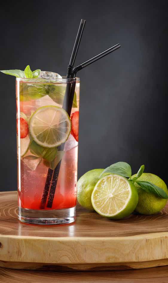 Step 5. Garnish with a strawberry slice, lime/lemon and a sprig of basil.