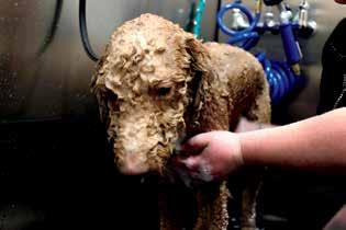 Although baths aren’t his favorite, he sits well while Taylor uses our Sensi-Skin shampoo to avoid irritation on his sensitive skin.