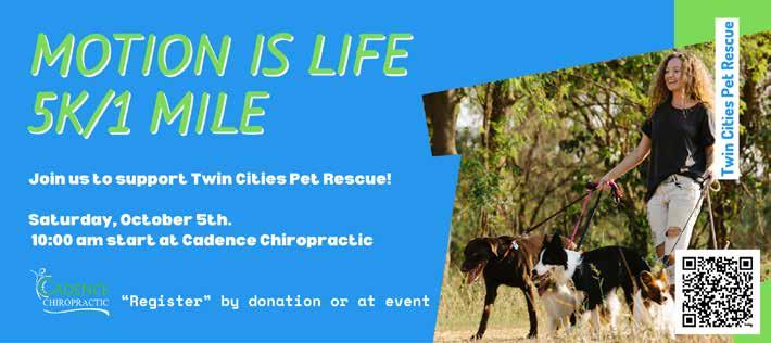 The Cadence Chiropractic Motion Is Life fundraiser is back! Run or walk the 5K or 1-mile route. Bring your always-eager pooch. Bring an unregistered guest, too – s’all good! All funds raised will go straight to Twin Cities Pet Rescue, which has placed more than 4,500 animals with loving forever families since 2009. Register online at buff.ly/3YVo3VS