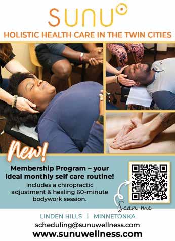 Explore the benefits of holistic health and wellness with SuNu’s new monthly membership program which includes a chiropractic adjustment and healing 60-minute bodywork session tailored to your needs. Embrace balance and renewed energy as SuNu's expert practitioners guide you on your wellness journey. Additional perks and discounts are available to enhance your experience. Treat yourself to all SuNu Wellness has to offer and embrace a life of wellness, naturally. sunuwellness.com or 952-314-7035 for more.