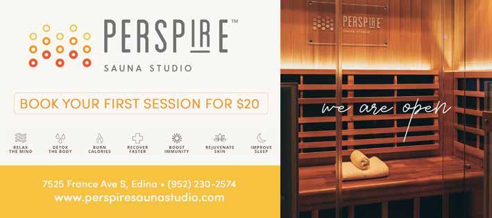Perspire Sauna Studios strives to bring the benefits of infrared saunas to communities in a friendly, comfortable, spalike atmosphere. To help everyone to ignite the wellness within. With a focus on excellent customer service and unique guest experience, Perspire aims to set the standard for infrared sauna and red light therapy studios across the country as they expand to bring IR sauna healing and red light therapy to every community. 7525 France Ave. S. perspiresaunastudio.com. 952-230-2574.