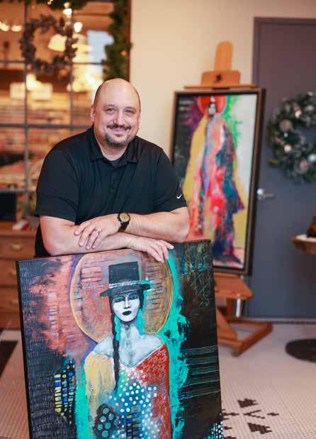 “He's from the Cheyenne River Tribe in South Dakota, and I found him at a Native American art marketplace many years ago,” says Greg. “He does his artwork on old ledger paper with a contemporary twist.”