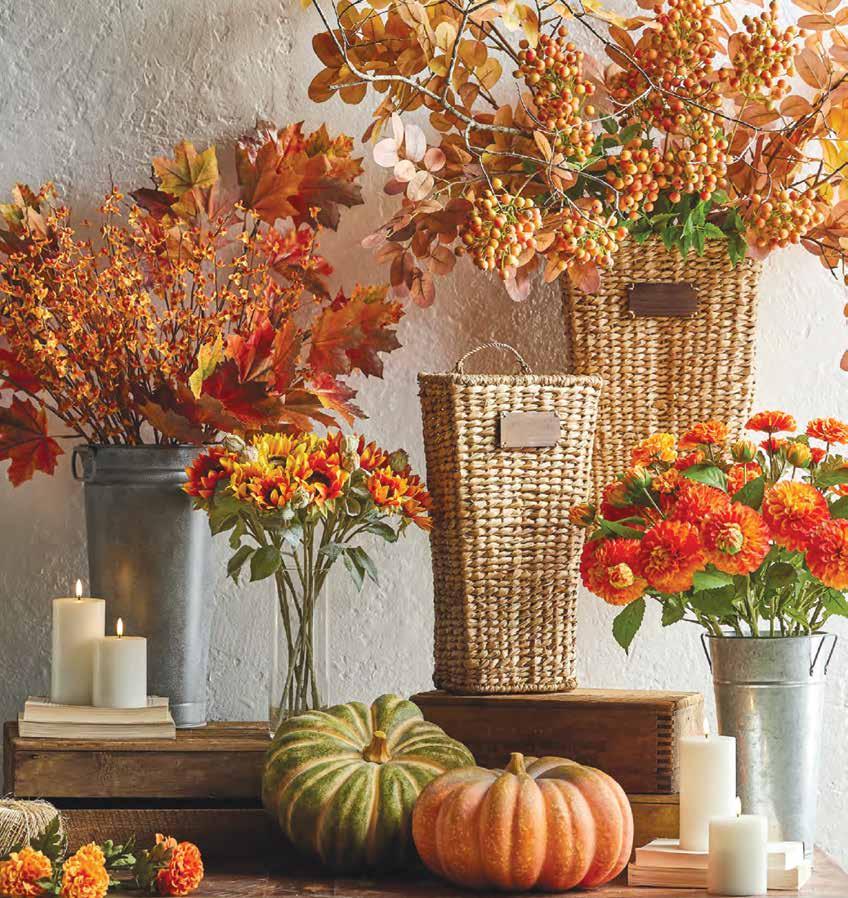 • Faux leaves, dried cotton branches, wooden craft rounds