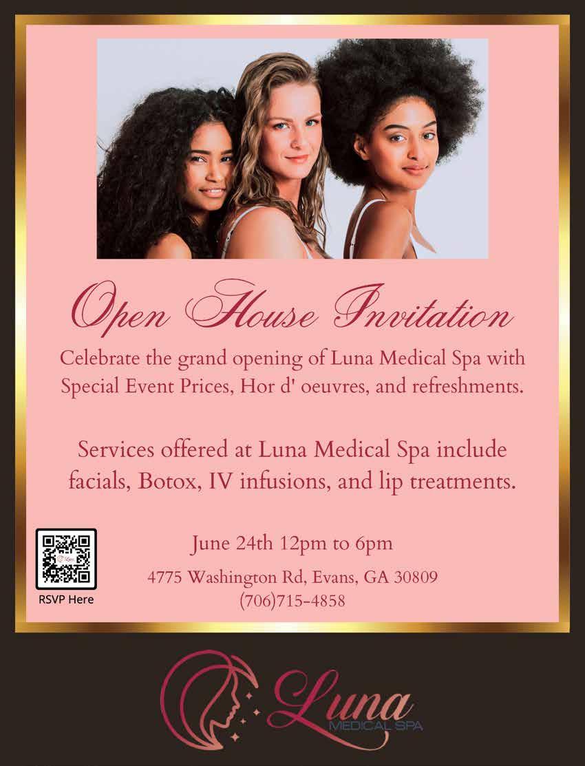 There’s a new medical spa coming to Evans! Luna Medical Spa opens this month and they offer Botox (cosmetic and medical), Dermal Fillers, Microneedling, PRP facial, Medical Grade Chemical Peels, IPL Laser Hair Removal, and so much more! You are invited to join them for their Open House on June 24th from 12pm - 6pm. Celebrate with Special Event Prices, Hors d’oeuvres, and refreshments. RSVP by visiting eventbrite.com and searching Luna Medical Spa Open House Event. They are located at 4775 Washington Road in Evans.