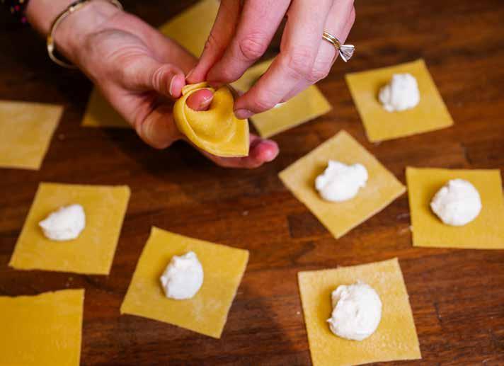 Today, a Cucina Concepts class unfolds like a recipe passed down through generations, familiar yet full of intention. Guests arrive and are immediately put to work. On a large wooden table surrounded by community, flour is poured, eggs are cracked, and hands begin the meditative work of forming dough. As it rests, the room shifts into aperitivo. Glasses are poured, small bites are shared, and conversation begins to bloom. Then it is back to the table to shape the pasta, fingers folding and pinching tortellini as laughter fills the space. Eventually, the work gives way to rest as the guests sit back and the courses are prepared and plated. A second course, the pasta they made together, and dessert close the night. What surprises Payton most on these nights are the moments of connection that unfold naturally. Groups of strangers who arrive politely reserved often stay hours after dessert, finding friendship in one another. “What brings me the most joy is hearing the laughter,” she says. “Savoring the moment and the meal. Just being present.”