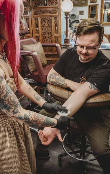 went all-in. Tucker, who had been selling advertising at a radio station, was diagnosed with M.S. and lost his job. They splurged on a tattooing machine and didn’t look back. After a short apprenticeship in a culture that didn’t fit and a couple of years working out of an improvised space, Original Skin officially opened in 2022.