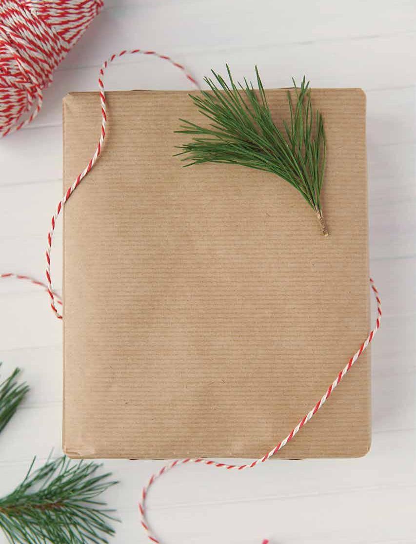 For gifts with a rustic, organic feel, use seasonal accents, such as sprigs, pine cones and cinnamon sticks, tied up with twine, encircling recycled paper for the wrapping.