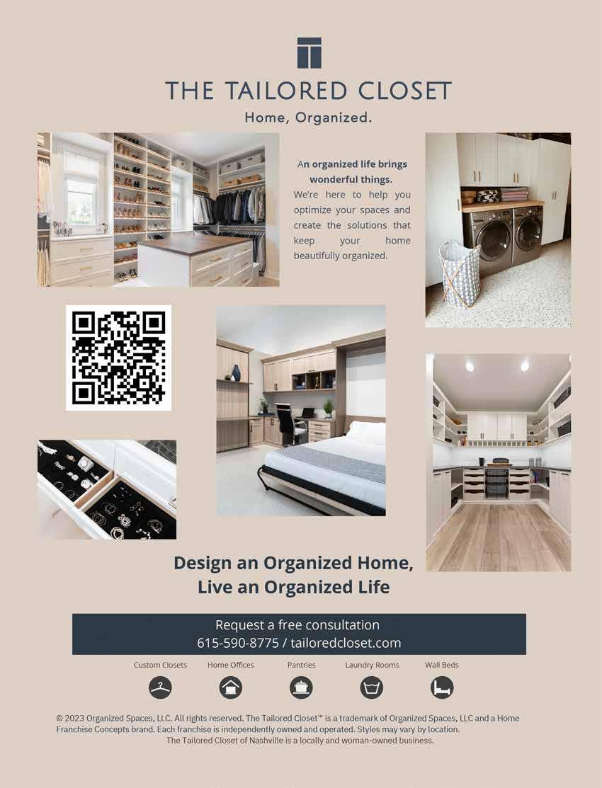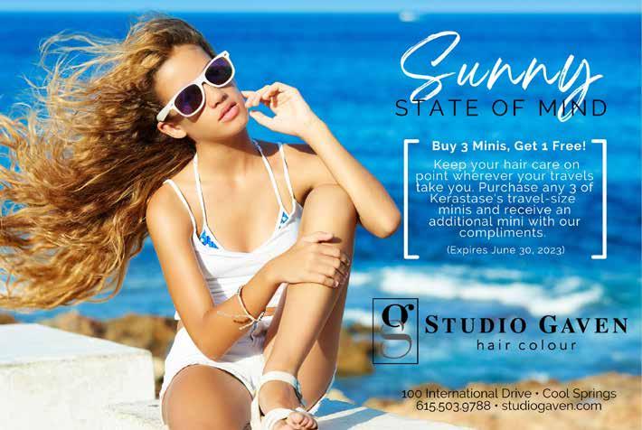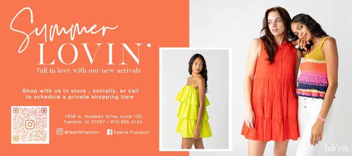 RETHINK YOUR HAND SOAP IMAGINE A HAND SOAP THAT’S ACTUALLY CLEAN! MADE WITH: organic coconut oil organic olive oil organic sunflower oil organic aloe vera leaf juice organic shea butter organic rosemary extract BUY NOW AT AMBERVALEHOME.COM HAND-CRAFTED IN FRANKLIN, TN Flooring Storage Organization InstaVac Call 1.888.59.GARAGE or visit HelloGarage.com Flooring, Storage & Organization Book your free estimate today! NOW OPEN IN COOL SPRINGS (Next to New Moon Yoga) 2000 Meridian Blvd, Ste-120 Franklin, TN 37067 Follow us @cleanjuicecoolsprings 615.567.6965 WE HAVE AN EXCLUSIVE CLEANSE CLUB REST & RESET YOUR BODY // UP TO 15 POUNDS OF ORGANIC PRODUCE IN EACH CLEANSE // PRIVATE COMMUNITY GROUP We are more than just juice! 145 | CITYLIFESTYLE.COM/FRANKLIN JUNE 2023