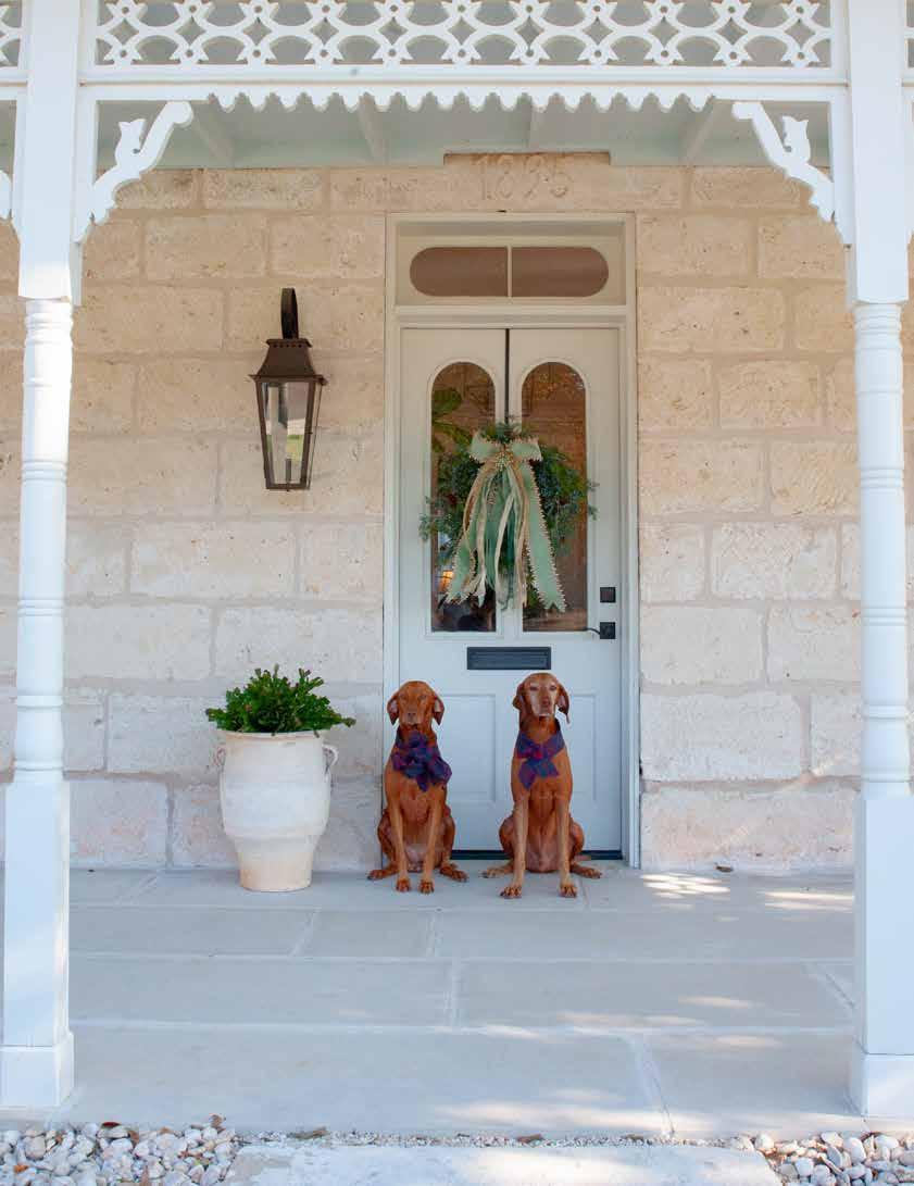 Our cover photo was taken at SDS (Slaughter Design Studio) with designer Amy Slaughter's Visla pups Hank and Honey at her historic home/place of business originally built in the mid-1800s. The decorative holiday wreath was designed by Glashaus Floral Design.