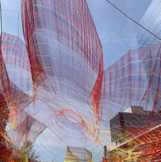 five-petaled forms that float gently in the air. The intricately designed work uses nearly 90 miles of fiber to create the 165-foot-long span.