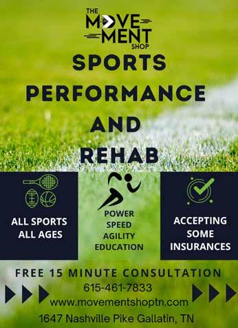 Wellskin Dermatology & Aesthetics is TENNESSEE’S FIRST Ellacor provider Achieve visible, natural-looking results without the excessive pain and extended recovery time that may be associated with more invasive surgeries or procedures. Natural Look. Noticeable Results. First 3 patients to mention this ad and purchase a series of Ellacor will receive a $500 WellSkin Gift Certificate. NON-SURGICAL FACELIFT www.wellskinmd.com | 615-675-0444 1630 Nashville Pike Gallatin, Tennessee 37066 AESTHETICS APPOINTMENT TODAY! 615.647.6880 OR ONLINE AT WELLSKINMD.COM never a bad time to let your light brighter. But now is as good as any! And here’s a little kickstarter for you: offering $100 off all laser treatments and 10% off chemical peels!* *offer good through January 31st. 1630 Nashville Pike, #200 I Gallatin, TN 37066 I 615.647.6880 also located in the The Boulevard Salon & Spa | 122 Goodview Way | Gallatin Scan to Schedule a Consultation 615 796 4845 info@mirepoixnashville.com www.mirepoixnashville.com Personal Chef Service Meal Plans, Private Dinners, & Events. Menu Creation, Shopping, and Clean-Up is Included. Local to Gallatin. Visit Dr. Jennie at our Hendersonville location or visit our other convenient locations: Goodlettsville | Hermitage | Smyrna $29 NEW PATIENT SPECIAL Exam, Consultation and Adjustment Open nights and weekends, walk-ins welcome. HENDERSONVILLE LOCATION: 1006 Glenbrook Way Suite 120, Hendersonville, TN 37075 Open 7 days a week t: 615-703-3268 SCAN FOR NEW PATIENT SPECIAL 39 | CITYLIFESTYLE.COM/GALLATIN JULY 2023