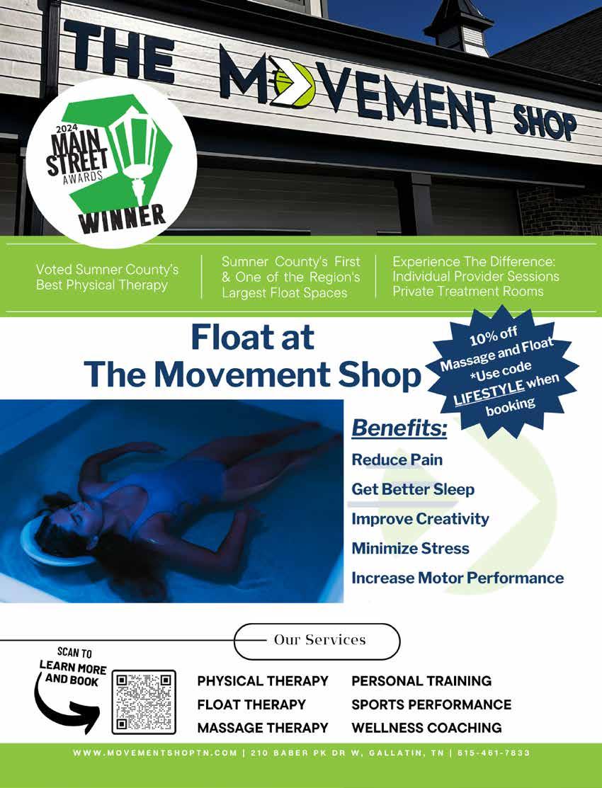 One of the trendiest new offerings is their new float tank sessions. It helps with resetting the body from the chronic overstimulation we all face in our always-connected, notification-packed society. A float session begins by entering a dark, heated tank of body-temperature water packed with medical-grade Epsom salts. The salt enables your body to float effortlessly on top of the water. You lose sense of all tactile sensations, sight and sound in the most relaxing way while you feel completely weightless. Your breathing slows, your anxiety decreases and your overstimulated mind begins to clear, allowing bursts of creativity to bubble to the surface. Your body begins to deeply relax, possibly for the first time ever. As the session ends, you notice the chronic tension has fled and your mood is elevated on the short drive home as you notice the birds chirping and the sun shining. You greet your spouse and kids enthusiastically as you walk in the door and later experience the best sleep of your life. The Movement Shop caters to Gallatin and all of Middle Tennessee, offering the best float tank available today. The state-of-the-art tank is one of the largest in the region and the only float tank experience in Sumner County.